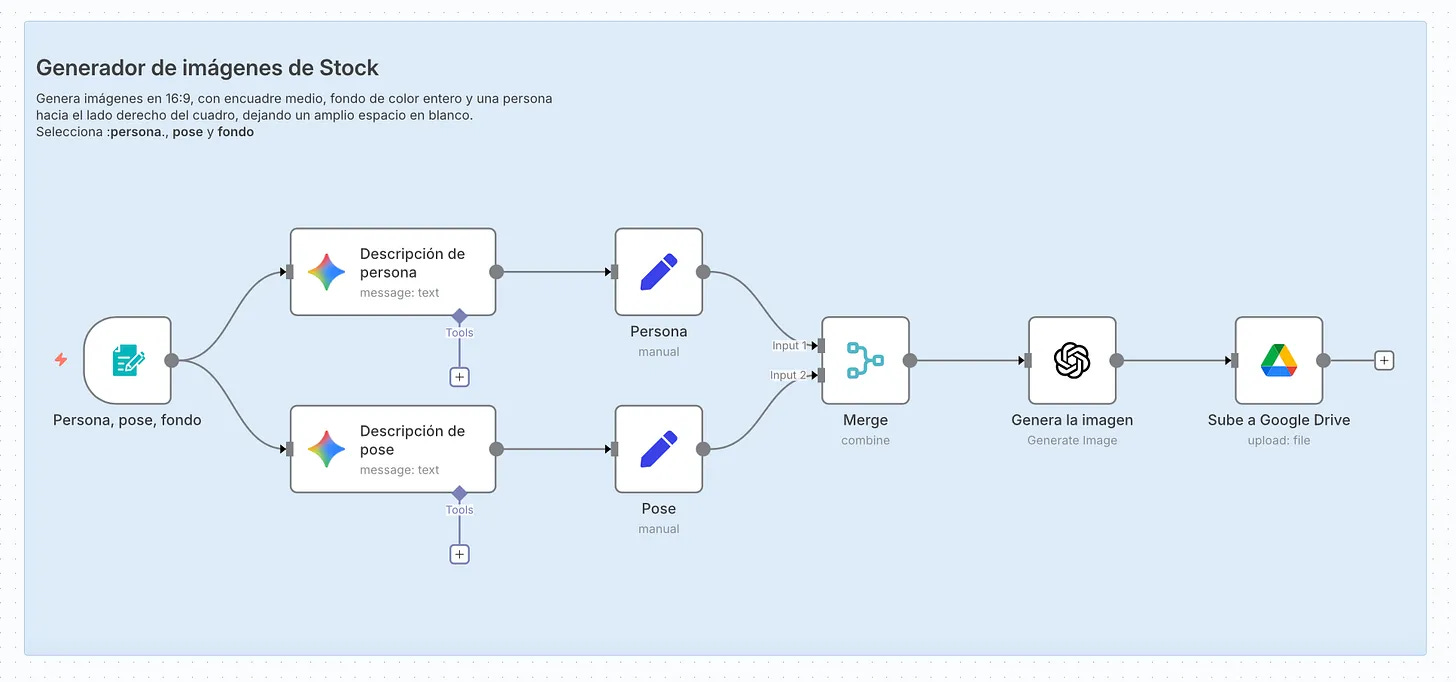 For example, I built this workflow where you input three things: a character, the character’s pose and a background color. With that info, a language model (Gemini) improves the character and pose descriptions, then ChatGPT creates a stock-style photo and it gets saved in Google Drive. Everything happens automatically, step by step, no code required.